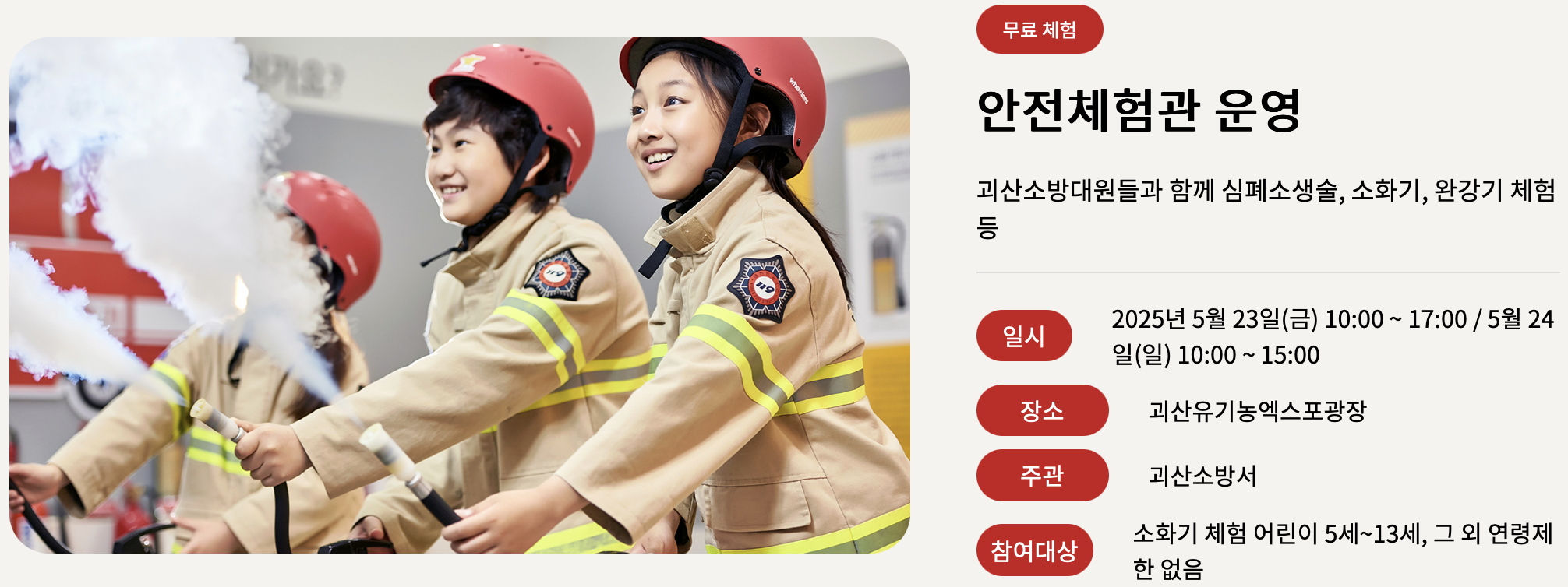 - 안전 체험관 : 심폐 소생술, 소화기, 완강기 체험 등