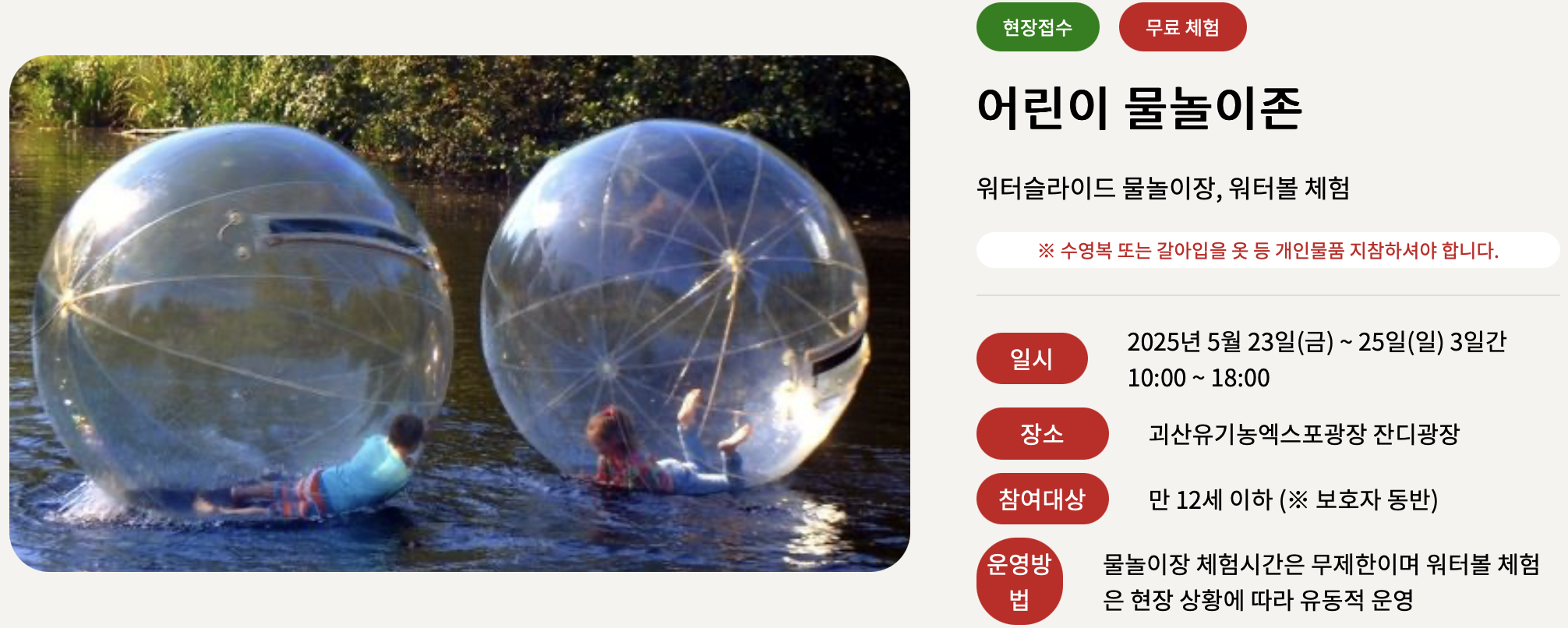 - 어린이 물놀이존 : 워터슬라이드 및 워터볼 체험 등