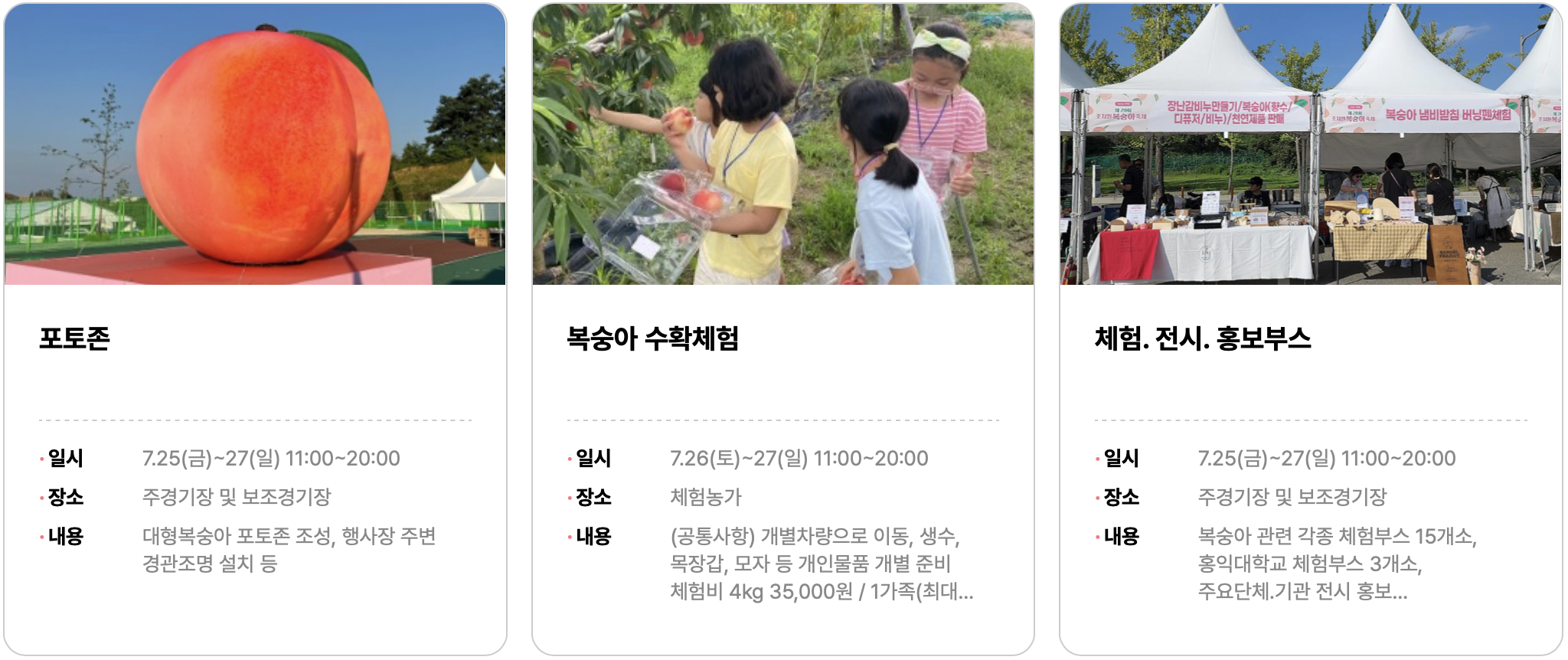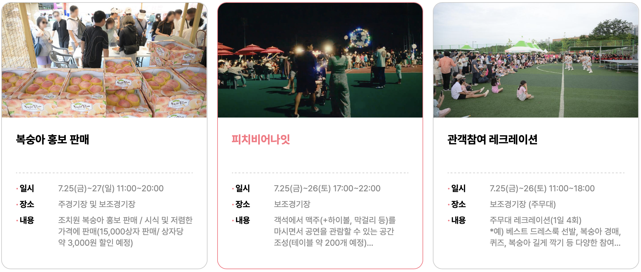 다. 체험 프로그램 : 복숭아 수확 체험, 워터 명랑 운동회, 관객 참여 레크레이션 등