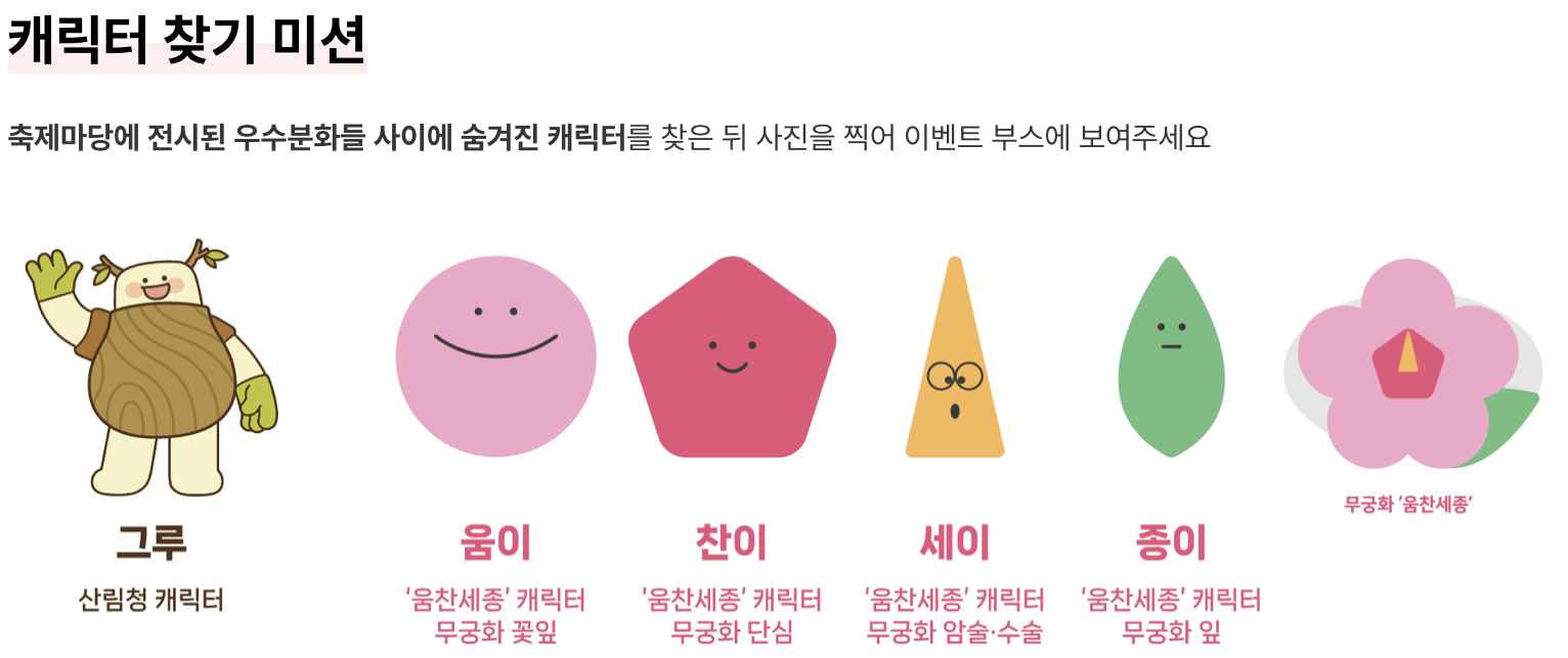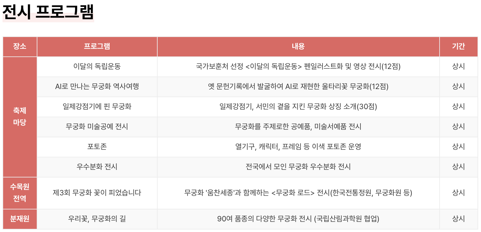 다. 참여 프로그램 : 반려 무궁화 키트 만들기, 한지 무궁화 태극기, 1초 무궁화 바디 페인팅 등