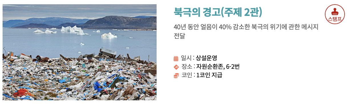 - 주제 공연 : 순수의 북극, 북극의 경고 (1코인 지급)