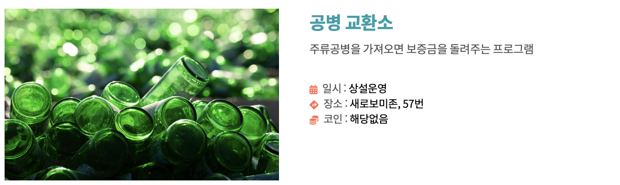 - 공병 교환소 : 주류 공병 지참 시, 보증금 환급