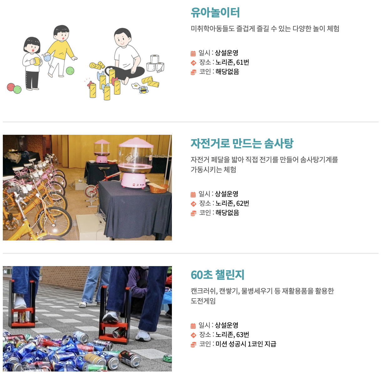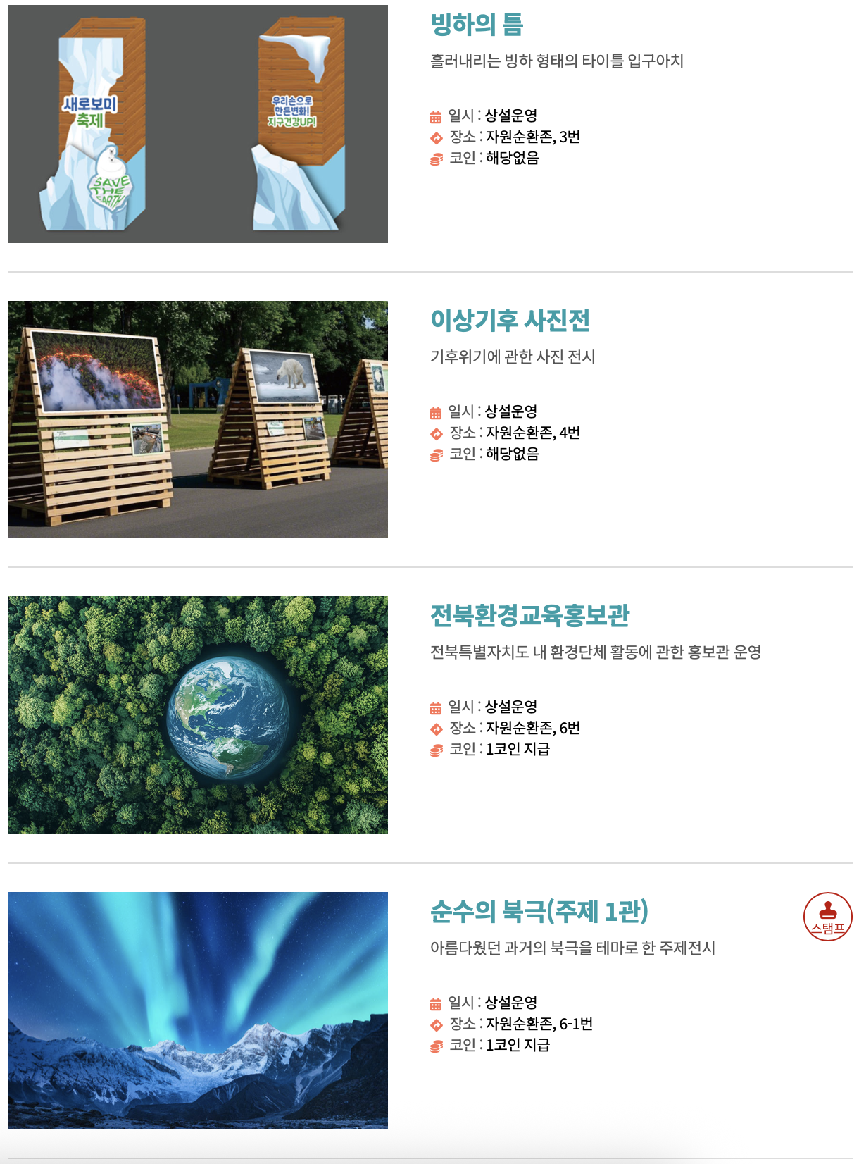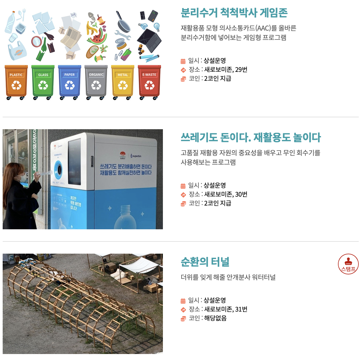 - 올바른 분리수거 캠페어 : 자원순환 전시 및 분리수거 방법에 대한 이벤트 (2코인 지급)