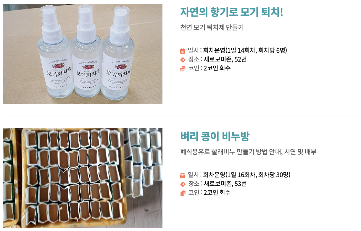 - 주방, 세탁세제 및 섬유 유연제 교환소 : 다회 용기 지참 시, 세제 및 섬유 유연제 리필 (1코인 지급)