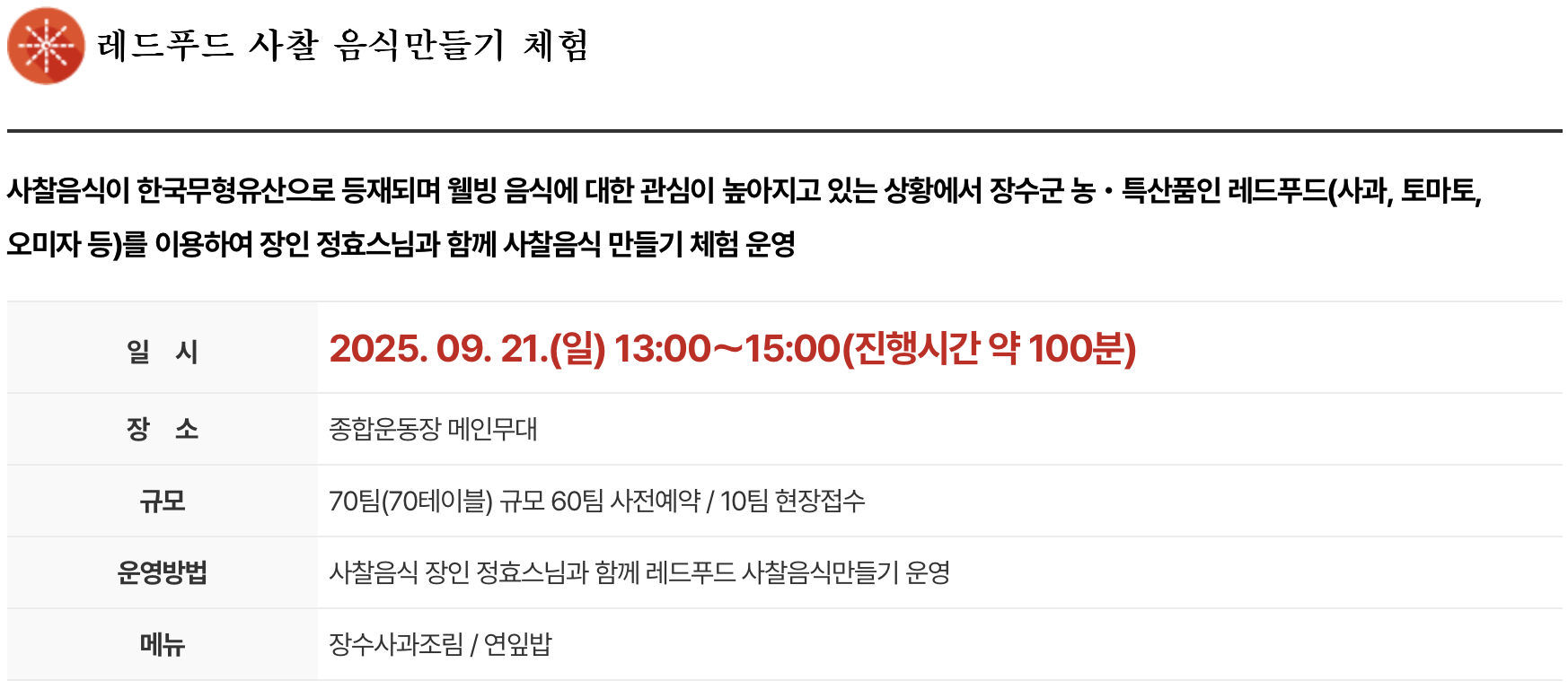 - 정효스팀과 함께하는 레드푸드 사찰음식 만들기