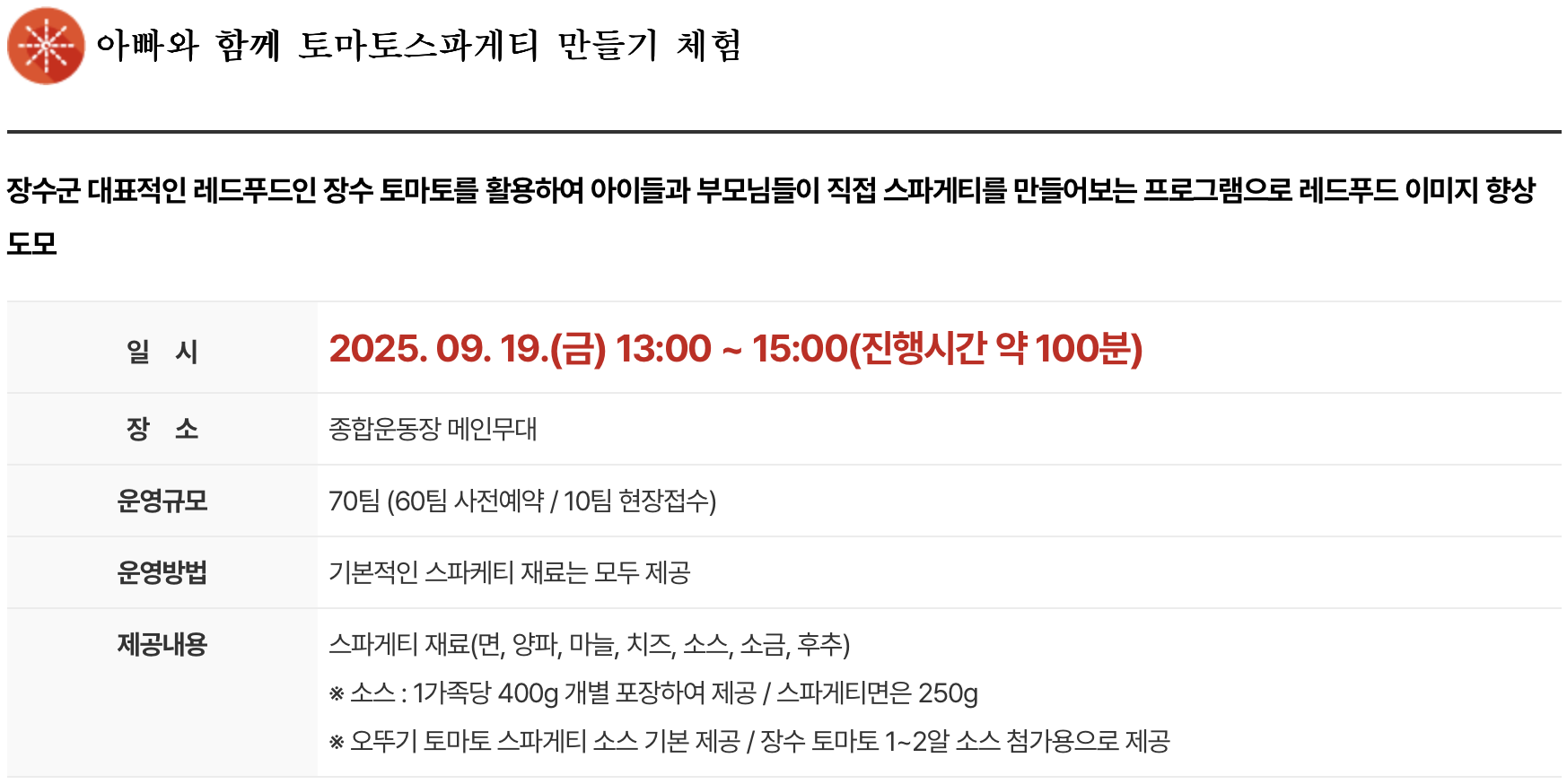 나. 부대 프로그램 : 토마토 스파게티 만들기, 레드푸드 요리 및 사찰음식 만들기, 전국 한우 곤포나르기 대회 등