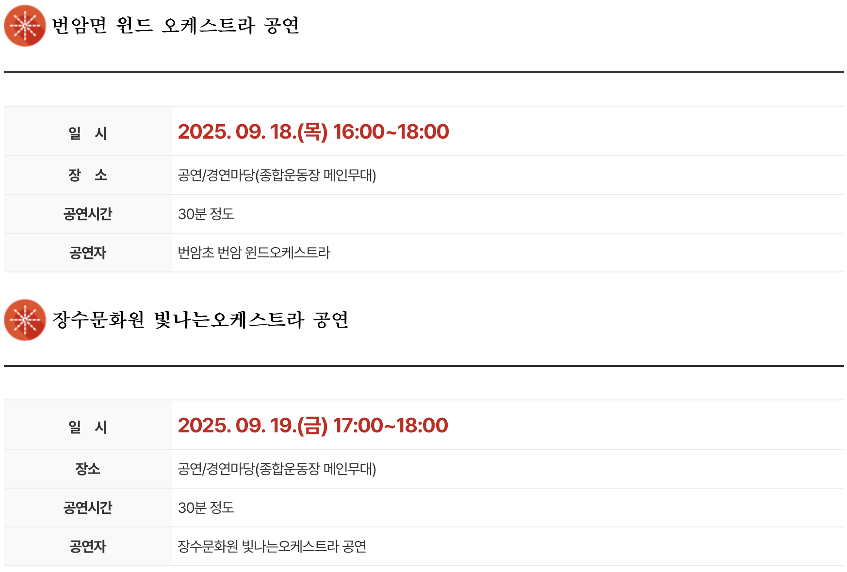 가. 공연 프로그램 : 개막 공연 및 불꽃놀이, 7080콘서트, 지역 예술 동호회 공연, 레드 콘서트, 오케스트라 공연 등