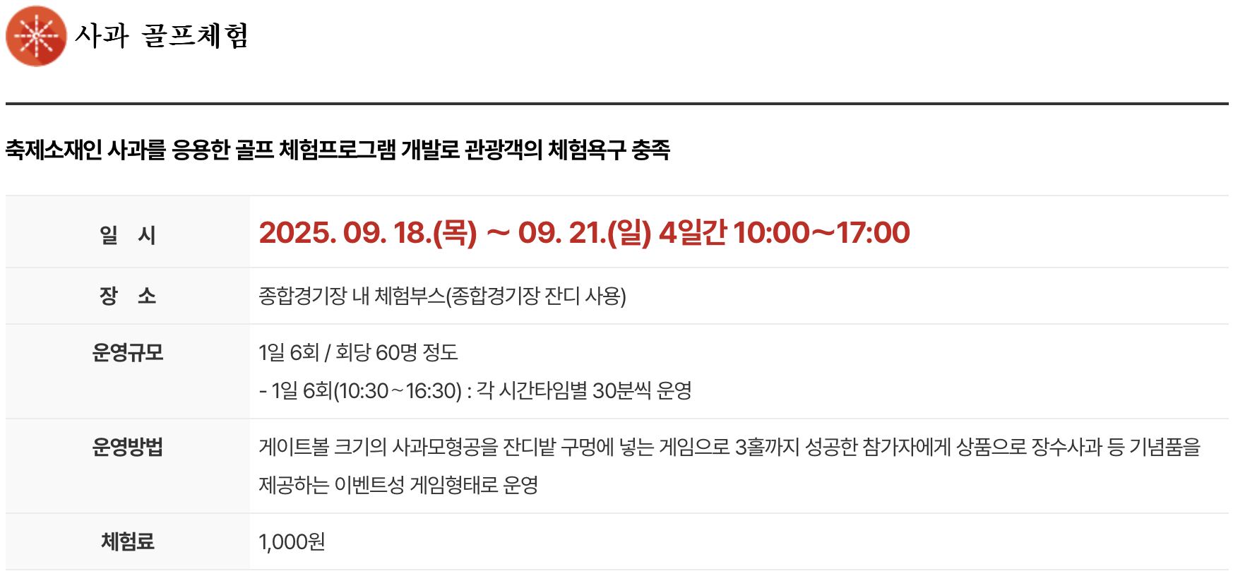 - 사과 볼링, 양궁, 골프 체험