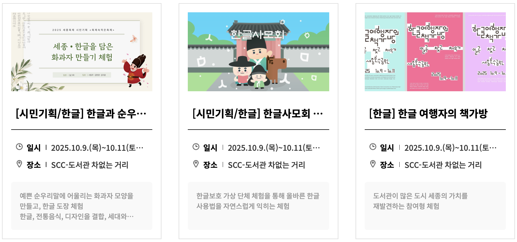 다. 체험 프로그램 : 순우리말 발굴단, 한글 화과자 만들기, 한글보호 가상 체험, 한복 체험, 한글 미니 체험 등
