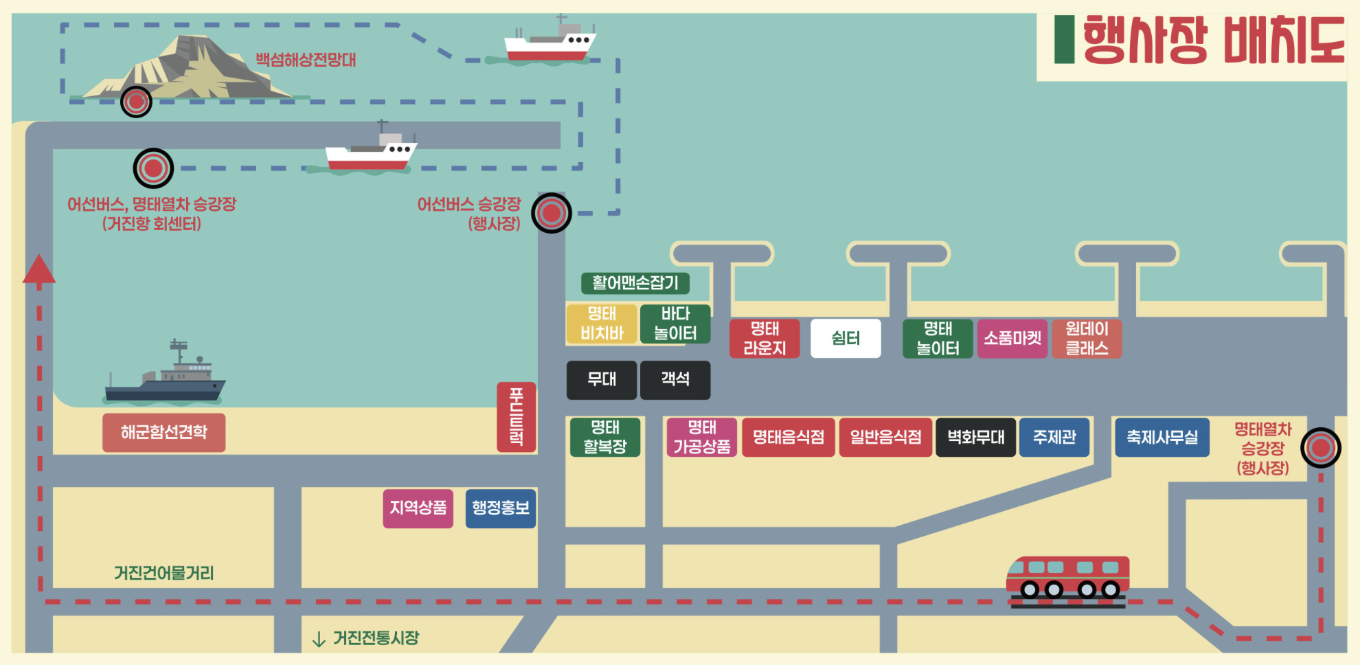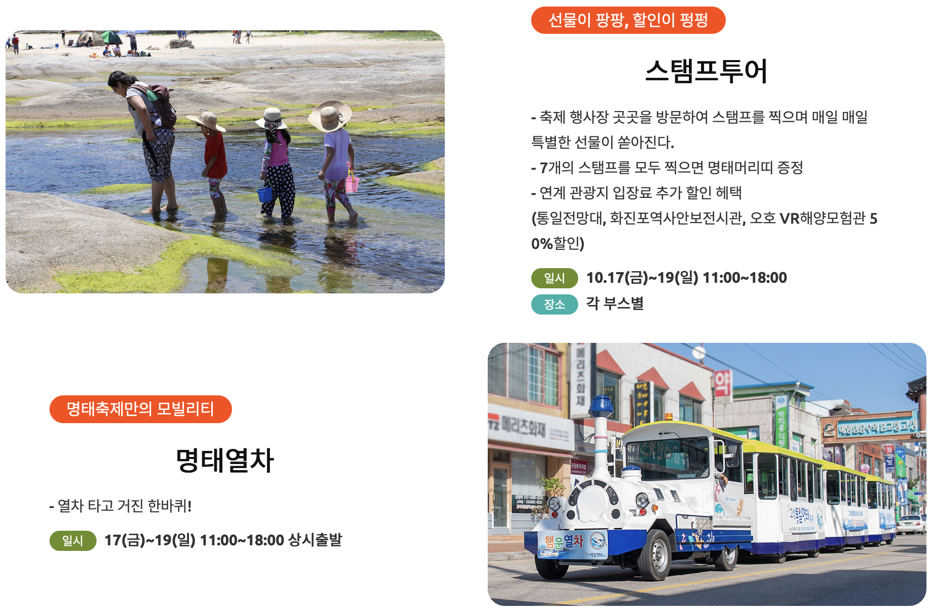 라. 기타 : 스탬프 투어, 어선 버스, 명태 사진전, 명태 소품 마켓, 명태 가공 상품관, 비치바 및 명태 라운지 등
