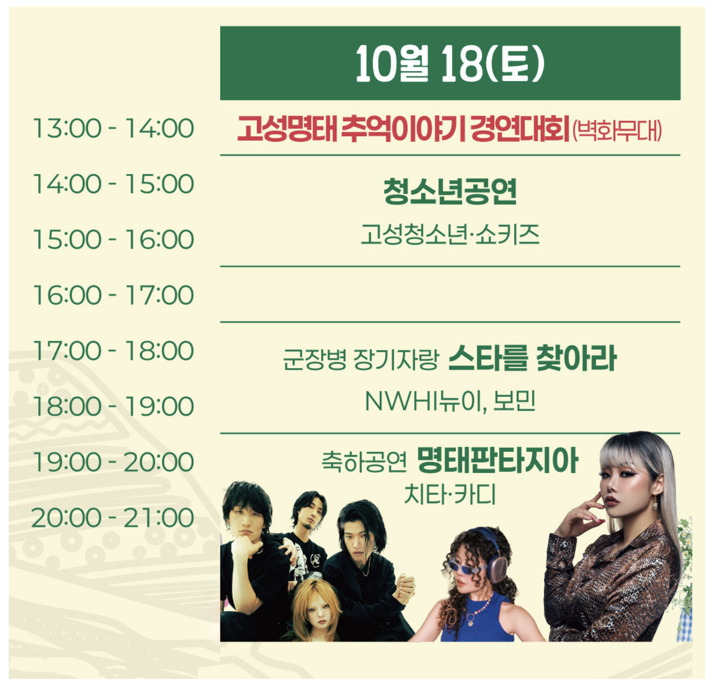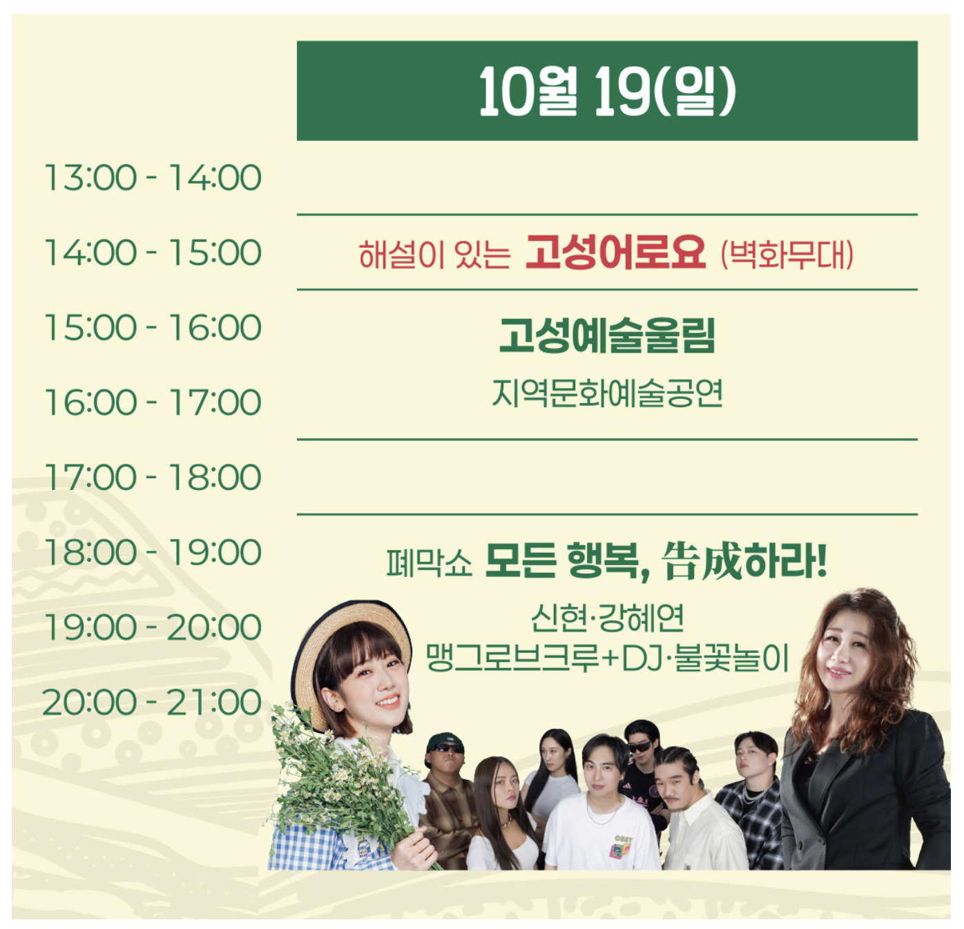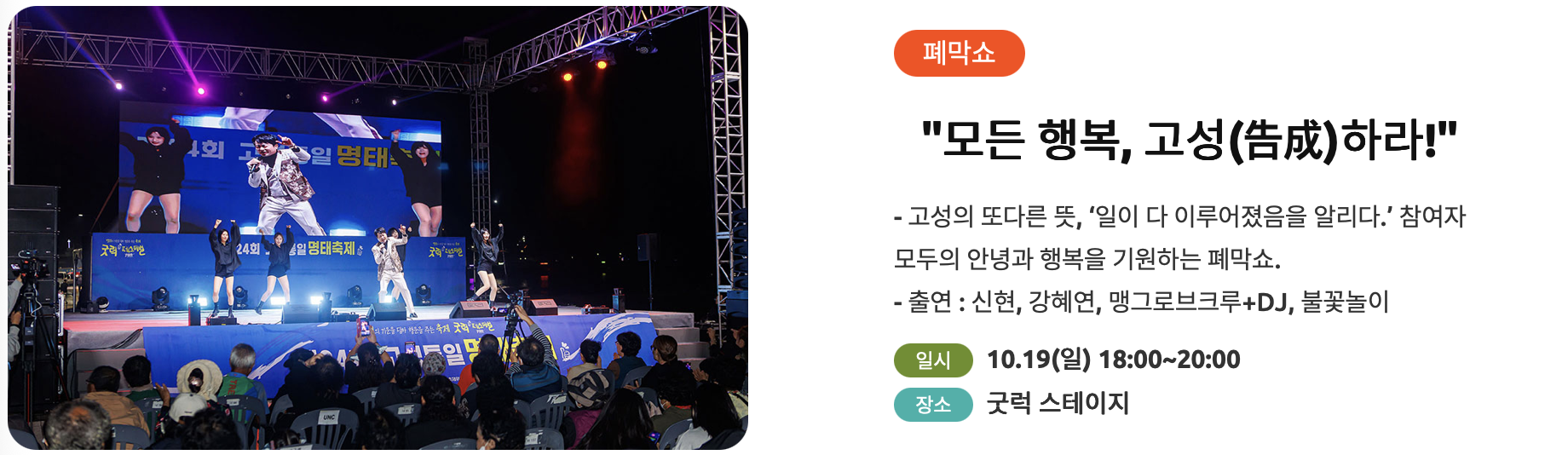 - 모든 행복, 고성 하라! (폐막쇼) : 신현, 강혜연, 맹그로브크루 출연 + DJ, 불꽃놀이