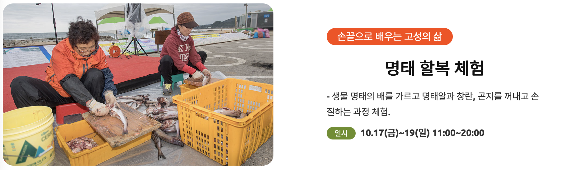- 명태 할복 체험 : 생물 명태 손질 체험