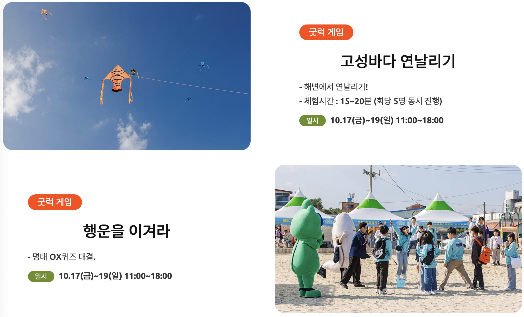 다. 체험 프로그램 : 명태 원데이 클래스, 명태 할복 체험, 해군 함선 견학, 활어 맨손 잡기, 연날리기 등