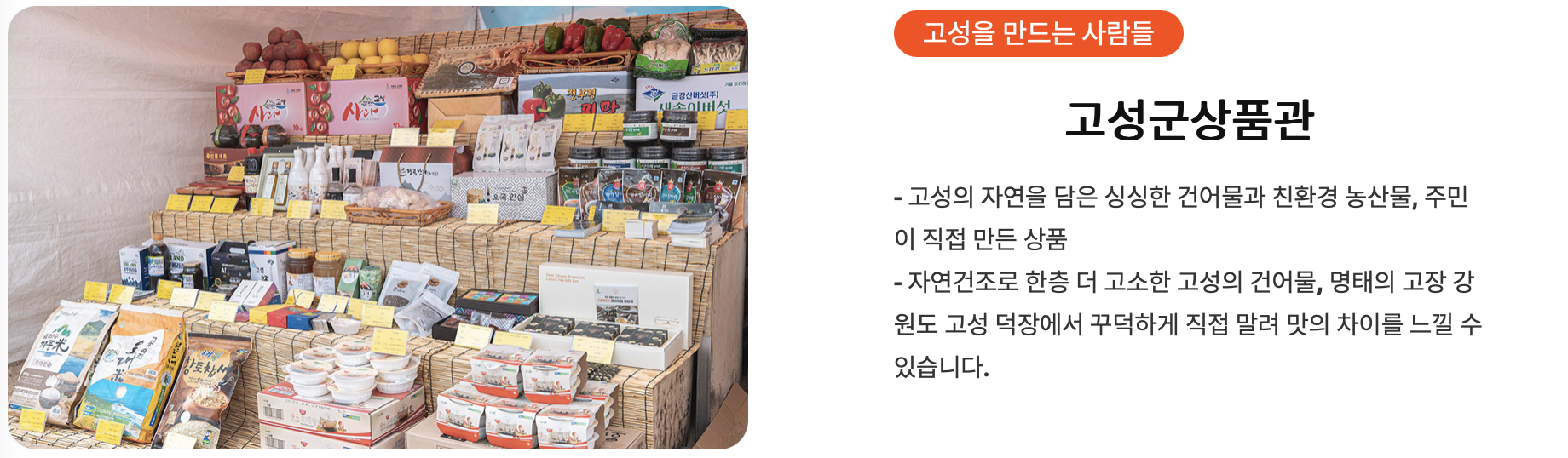 - 고성군 상품관 : 고성 건어물 및 농산물 등 판매
