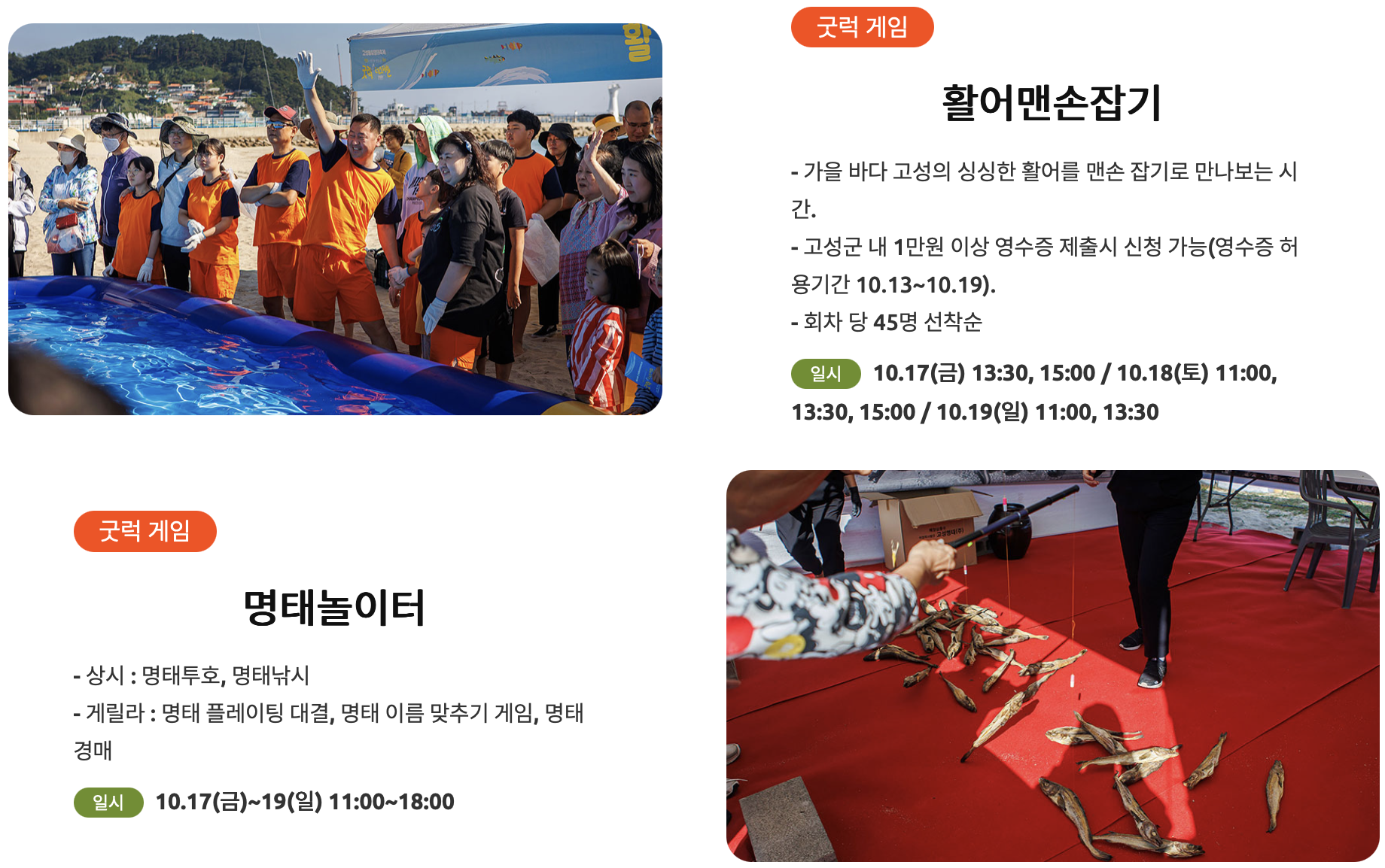 - 활어 맨손잡기 : 고성군 내 1만원 이상 영수증 제출 시, 신청 가능 / 축제기간 내, 총 7회 운영 / 회당 45명 선착순