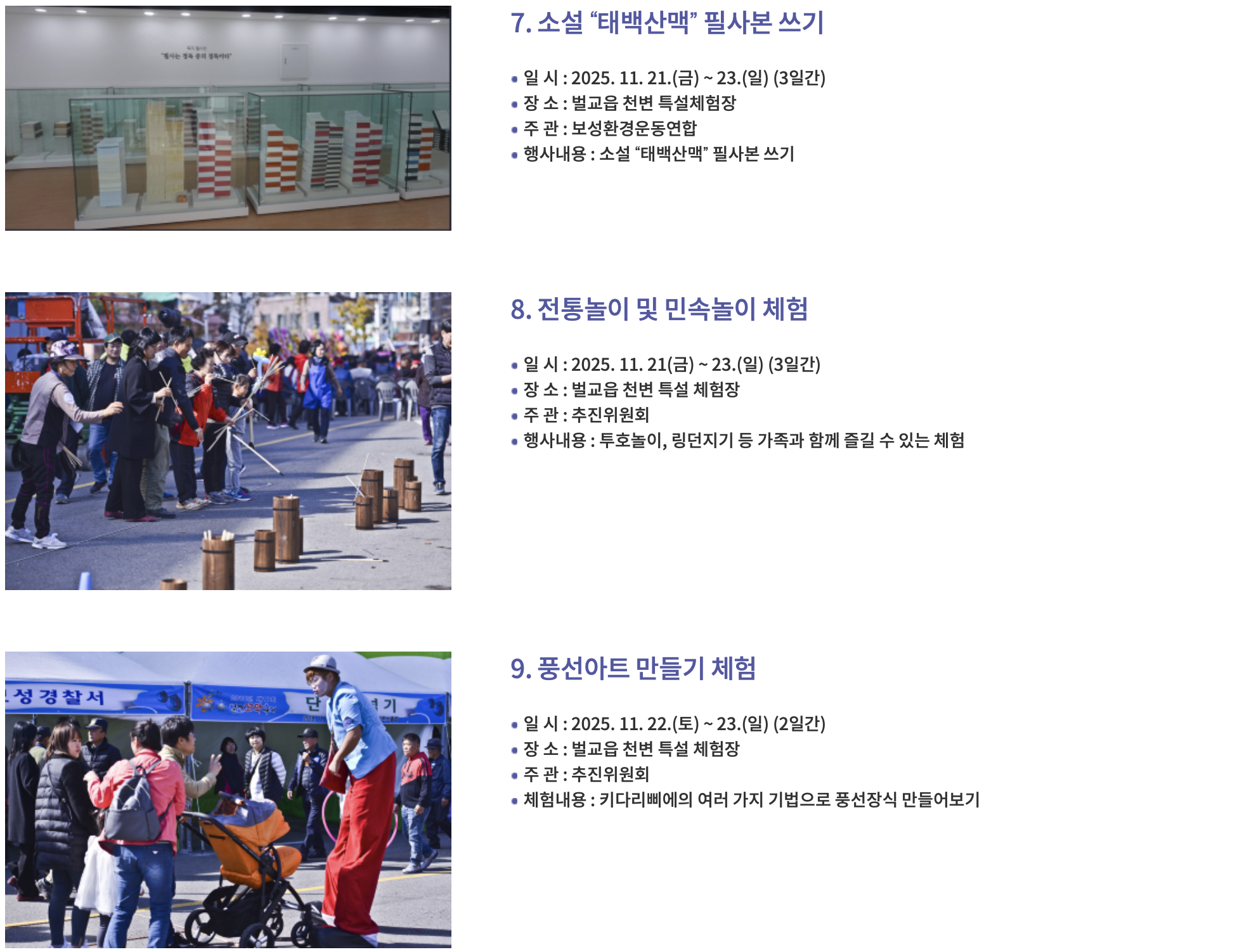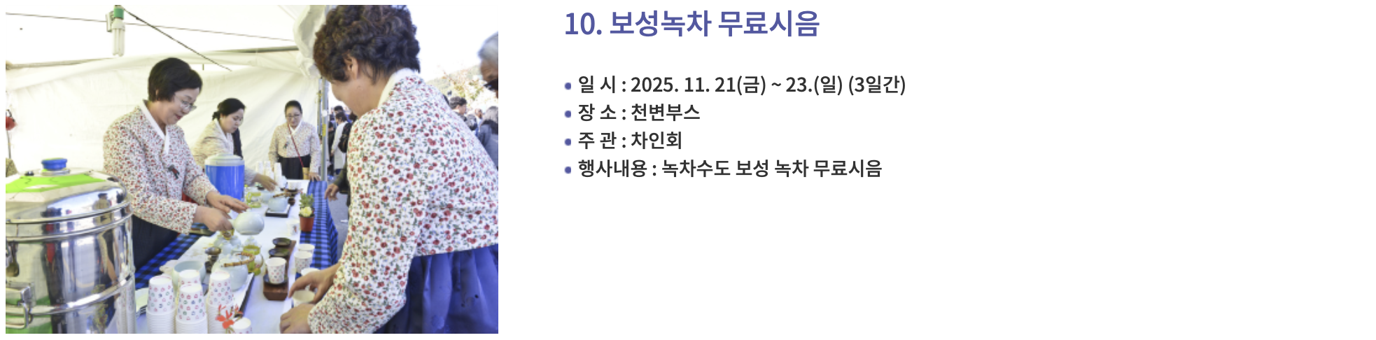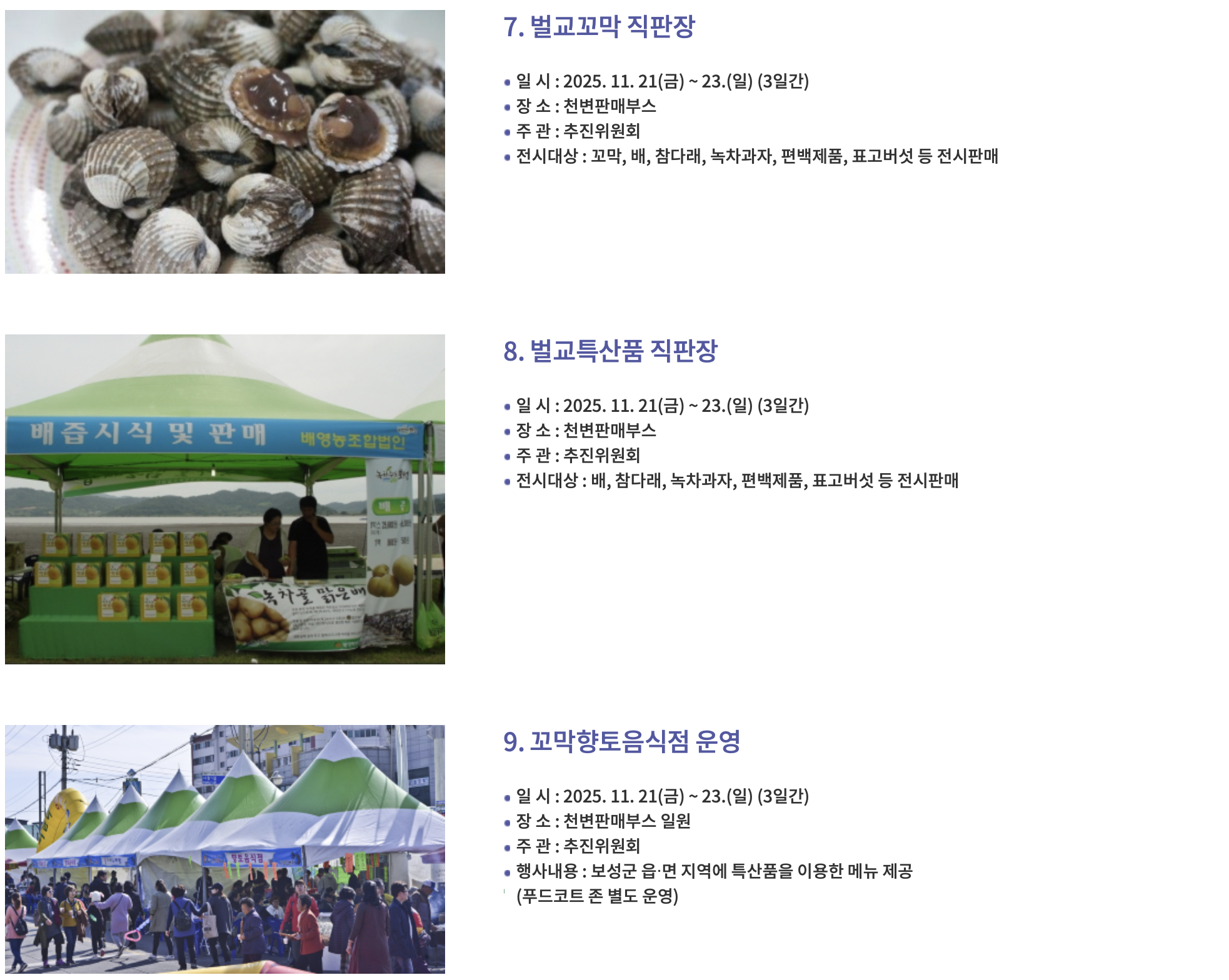 라. 기타 : 꼬막 경매, 벌교 꼬막 홍보관, 포토존, 북 토크, 벌교 꼬막 및 특산품 직판장, 보성녹차 무료 시음 등