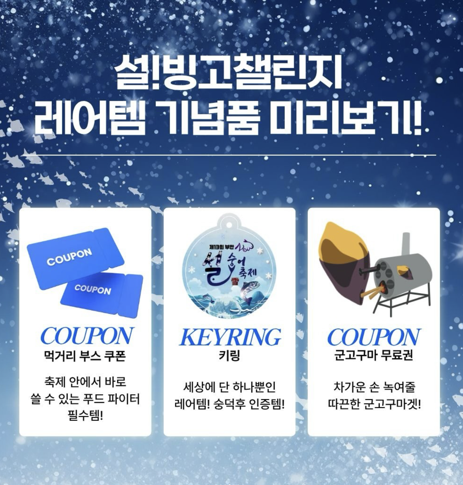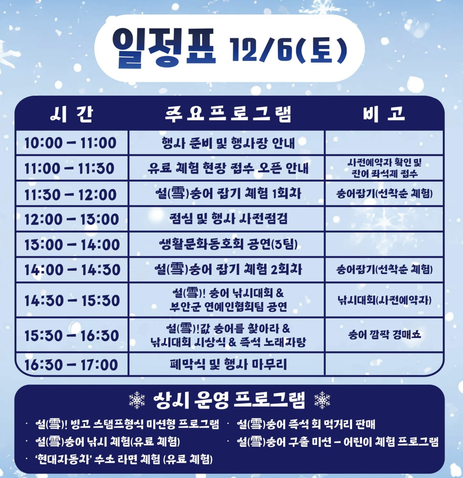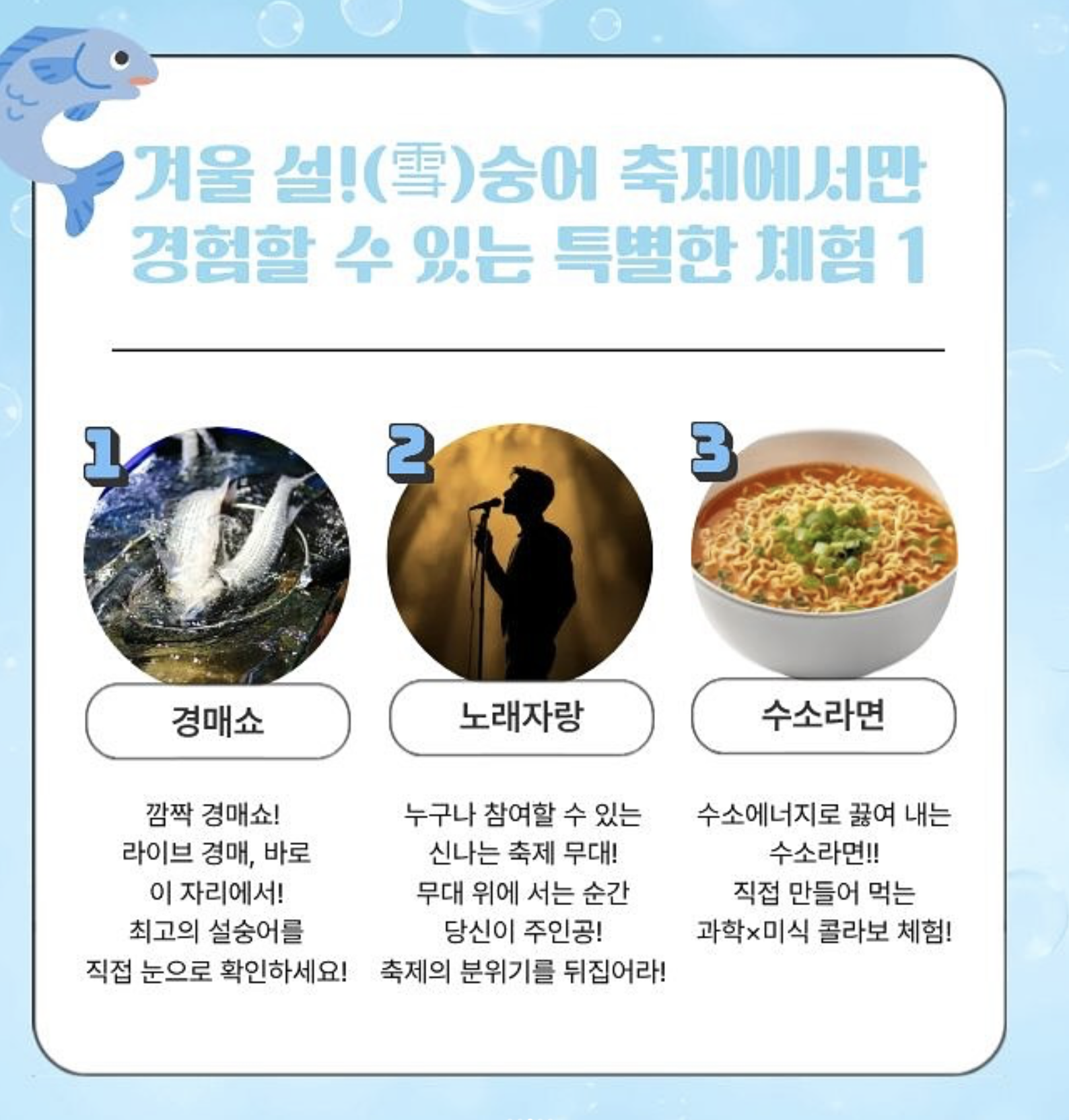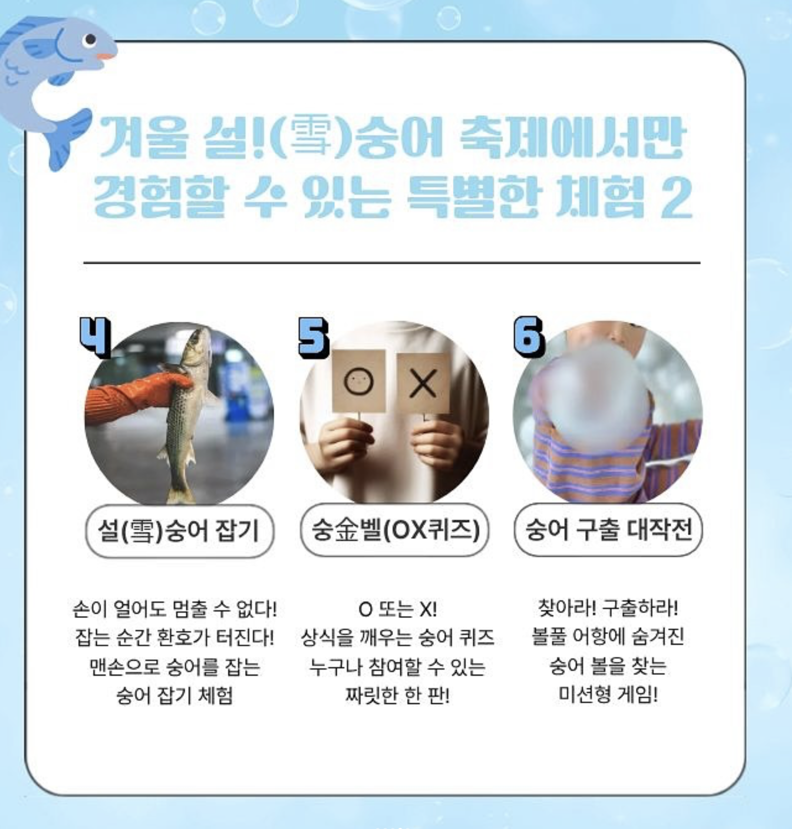 다. 체험 프로그램 : 숭어 낚시 체험, 숭어 잡기 체험, 얼음 속 숭어 구출 체험, 수소 라면 끓이기 체험 등