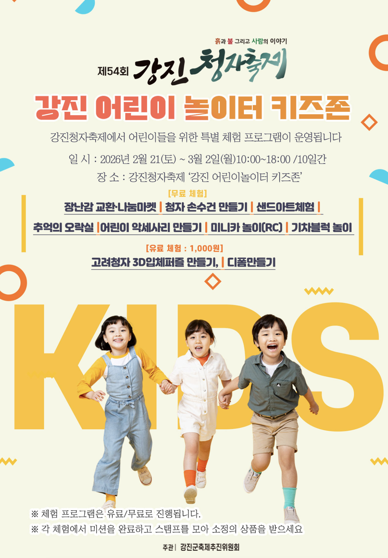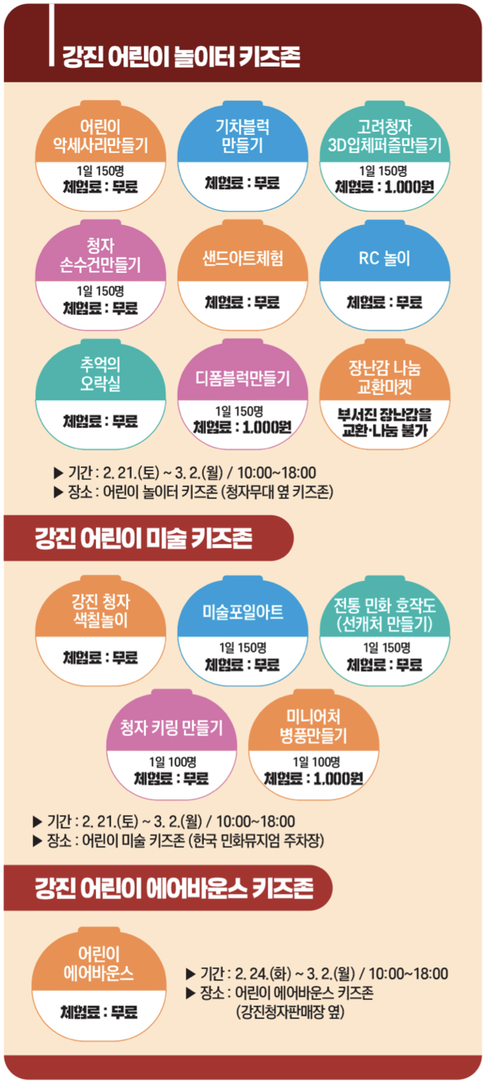 - 어린이 놀이터 키즈존 : 어린이 악세서리 만들기, 기차블록 만들기, 청자 손수건 만들기 등