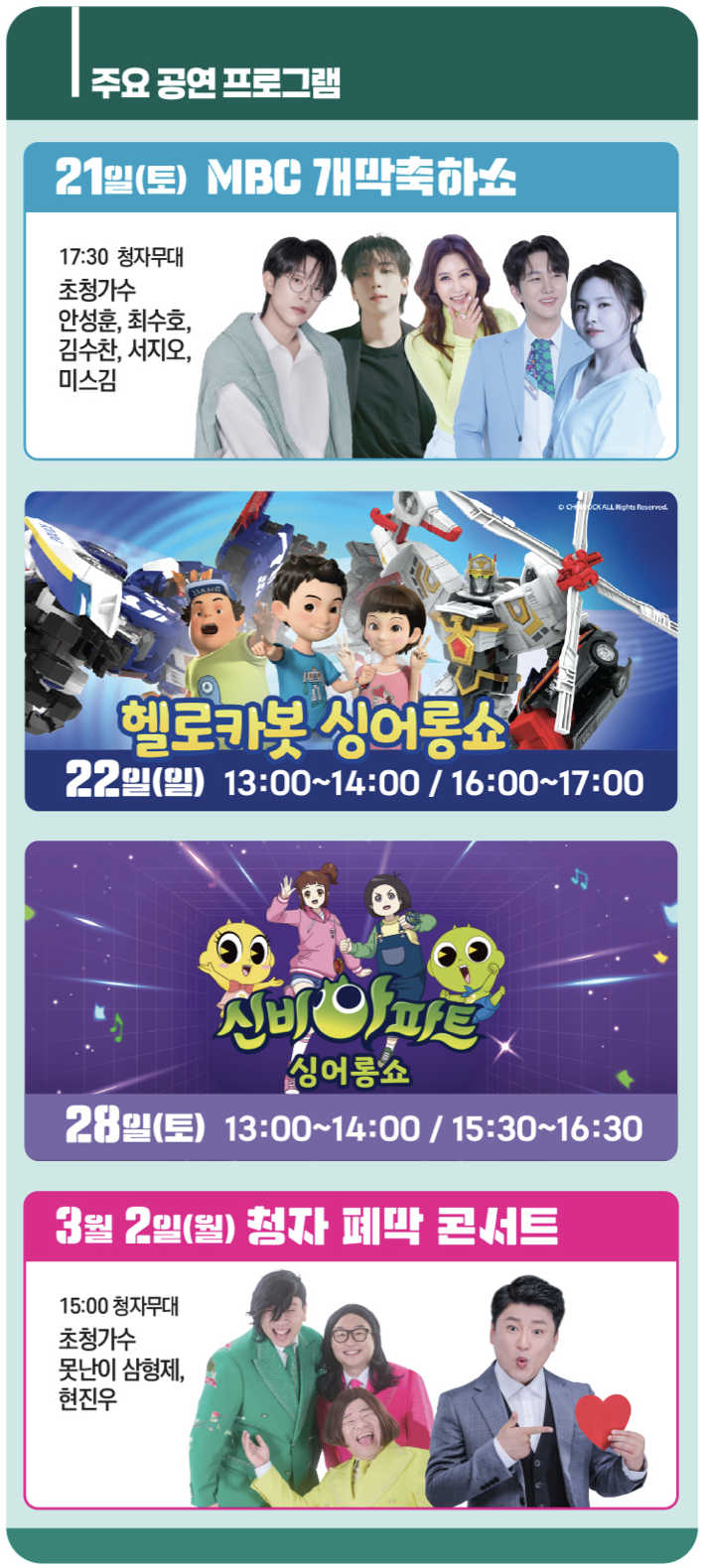 - MBC 개막 축하쇼 : 초청가수 (안성훈, 최수호, 김수찬, 서지오, 미스김)