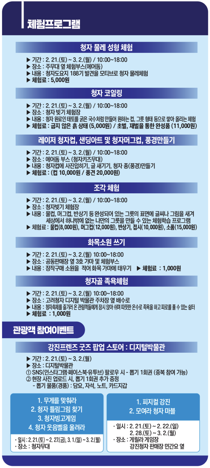 다. 체험 프로그램 : 강진 물레 성형 체험, 청자 코일링, 조각 체험, 족욕 체험, 청자 이벤트 게임 등