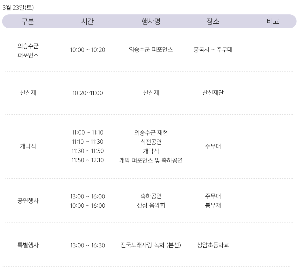나. 부대 프로그램 : 전국노래자랑, 의승수군 퍼포먼스, 산신제, 진달래 꽃맵시 선발대회, 산악인 등반대회 등
